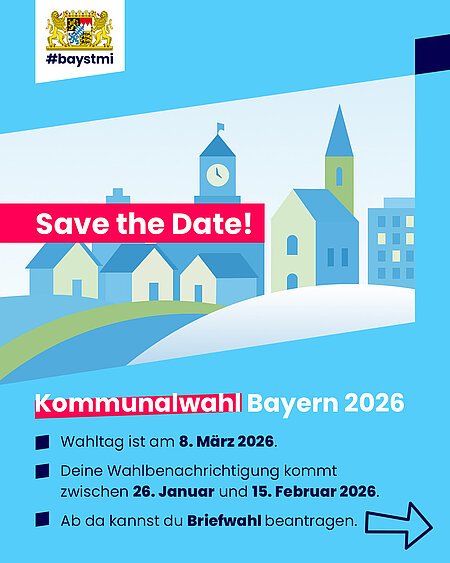 Du bist über 18 und wohnst in #Bayern? 📅 Save the Date: Am 08.03. sind #Kommunalwahlen in Bayern! Hier entscheidest DU: 🔹über deinen Gemeinderat oder Stadtrat, 🔹deine Bürgermeisterinnen oder Bürgermeister, 🔹deine Kreisrätinnen oder Kreisräte, 🔹deine Landrätinnen oder Landräte Du hast die Wahl über die Politik direkt vor deiner Haustür! 📬Deine Wahlbenachrichtigung kommt zwischen dem 26. Januar und 15. Februar 2026. Damit kannst du auch #Briefwahl beantragen. Merke dir gleich den Termin vor und mach mit. 🗳️ ℹ️Weitere Infos: www.deinewahl.bayern.de Fragen? Dann schreib sie uns gern in die Kommentare! 💬