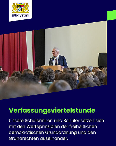 Unsere Demokratie lebt vom Mitmachen! 💪 Innenminister Joachim Herrmann nahm an der Verfassungsviertelstunde 🕒 des St.-Anna-Gymnasiums in München teil und diskutierte mit den Schülerinnen und Schülern. 💬 „Geben wir dem Diskurs über die Grundlage der Demokratie Raum, bewahren wir den Schatz unserer Freiheit und unseres Rechtsstaates.“ 💬 , so sein eindringlicher Appell. Regelmäßig findet an #Bayern|s Schulen die sogenannte #Verfassungsviertelstunde statt. Bereits ab der Grundschule ist diese in verschiedenen Jahrgangsstufen verpflichtend verankert. 📘 Unsere Schülerinnen und Schüler setzen sich so mit den zentralen Werten unseres Grundgesetzes und unserer Bayerischen Verfassung auseinander. ⚖️ Wir alle tragen durch unser Verhalten unter anderen auch in den sozialen Medien die Verantwortung für unsere #Demokratie. ➡️Denn: Die Würde des Menschen ist unantastbar - Art. 1 Abs. 1 GG