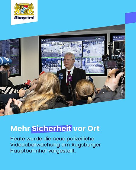 Sicherheit, die man sieht! 👀 ➡️ Ein starkes Bayern hat sichere Bahnhöfe!💪 Auch 2026 setzen wir auf den weiteren Ausbau der #Videoüberwachung im öffentlichen Raum.📹 Am Augsburger Hauptbahnhof stellte heute #Bayerns Innenminister @joachim.herrmann.csu gemeinsam mit der @stadtaugsburg und der @polizeiswn die neue polizeiliche Videoüberwachung vor. 👮 🔹So kann der wichtigste Verkehrsknotenpunkt im Großraum Augsburg noch effektiver überwacht und geschützt werden. Die Videoüberwachung der Bayerischen Polizei ergänzt die Videomaßnahmen der #Bundespolizei. 🚅 🔹Bei den 40 Städten mit mehr als 200.000 Einwohnern ist Augsburg in Sachen #Sicherheit auf Platz 3 in Deutschland - hinter München und Nürnberg. 🛡️ 🔹 Im Nachtragshaushalt 2025 sind 3,8 Mio. Euro für den #Ausbau der Videoüberwachung in Bayern vorgesehen. 💶 #SicherheitDurchStärke #DeutscheBahn
