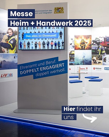 Tag 1 der @heimundhandwerk in the books. . . ➡️ Wart ihr heute schon auf der Messe in Riem unterwegs❓ Nicht? Dann habt ihr morgen und bis Sonntag noch die Gelegenheit, bei uns am Stand vorbeizuschauen! 👋 ➡️ Dort gibt's spannende Einblicke in unsere Kampagne #doppelengagiert! ♥️ Ehrenamtlerinnen & Ehrenamtler sind vor Ort und informieren, wie sie Job und #Ehrenamt unter einen Hut bekommen! 🚒 🚑 🏊 🚙🏔️ Wo findet ihr uns❓ ℹ️ Halle: A5 | Stand: 419 #BOS #helfen #wirfüreuch @bayroteskreuz @landesfeuerwehrverbandbayern @jugendfeuerwehr.bayern @freiwillige.feuerwehr.muenchen @asbbayern @dlrg_bayern @thwbayern @thwjugendbayern @malteser_bayern @malteserjugend_bayern @johanniter_bayern @bergwacht.bayern
