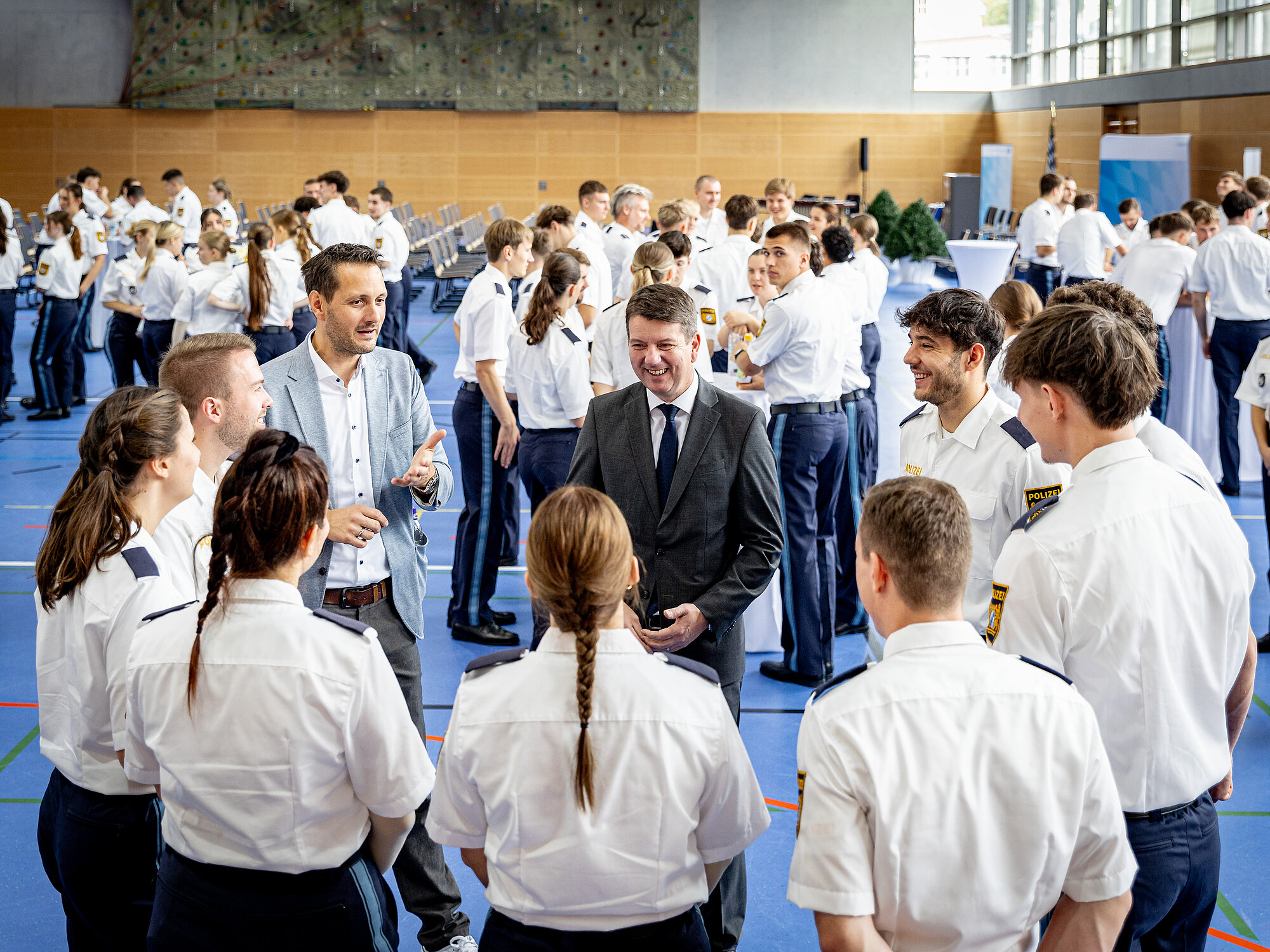 Die Nachwuchskräfte kommen aus ganz Bayern – einige sogar aus anderen Bundesländern. Ihre Werdegänge sind vielfältig: vom Kfz-Mechatroniker über den Koch bis hin zur Weinprinzessin. „Diese Vielfalt ist unsere Stärke. Die Bayerische Polizei ist ein Spiegel unserer Gesellschaft – bürgernah, weltoffen und leistungsstark“, betonte der Staatssekretär. Die Ausbildung und das Studium kombinieren theoretische Kenntnisse mit intensivem Praxistraining: Einsatz- und Fahrsicherheitstraining, Sport, Waffen- und Schießausbildung, Selbstverteidigung sowie Erste Hilfe gehören ebenso dazu wie Kommunikations- und Deeskalationstraining. „Wir fordern viel, aber wir bieten auch viel – eine Ausbildung auf höchstem Niveau, echte Teamarbeit und eine sinnstiftende Karriere mit Zukunft“, so Kirchner.